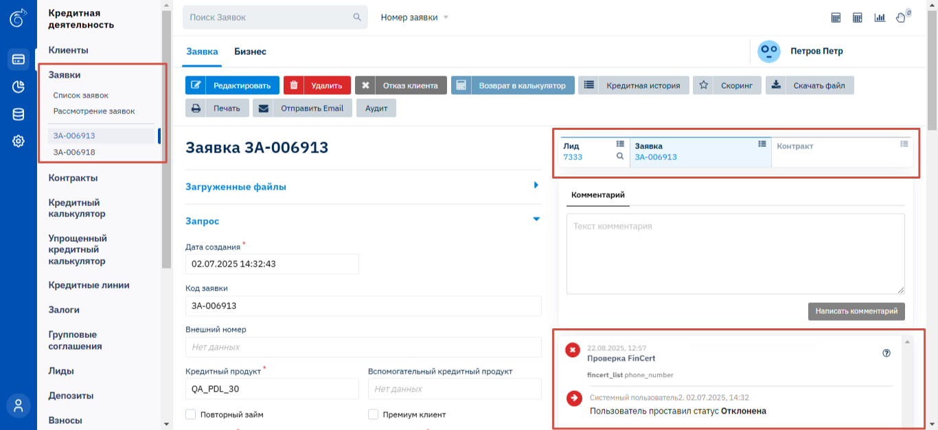 После создания новой заявки и прохождения шага проверки по данным ФинЦЕРТ в системе принятия решений, если указанный параметр (например, по мобильному телефону) найден в стоп-листах ФинЦЕРТ, в информационном окне заявки появляется соответствующее уведомление о результате проверки и примечанием по какому фиду было найдено совпадение в базе.