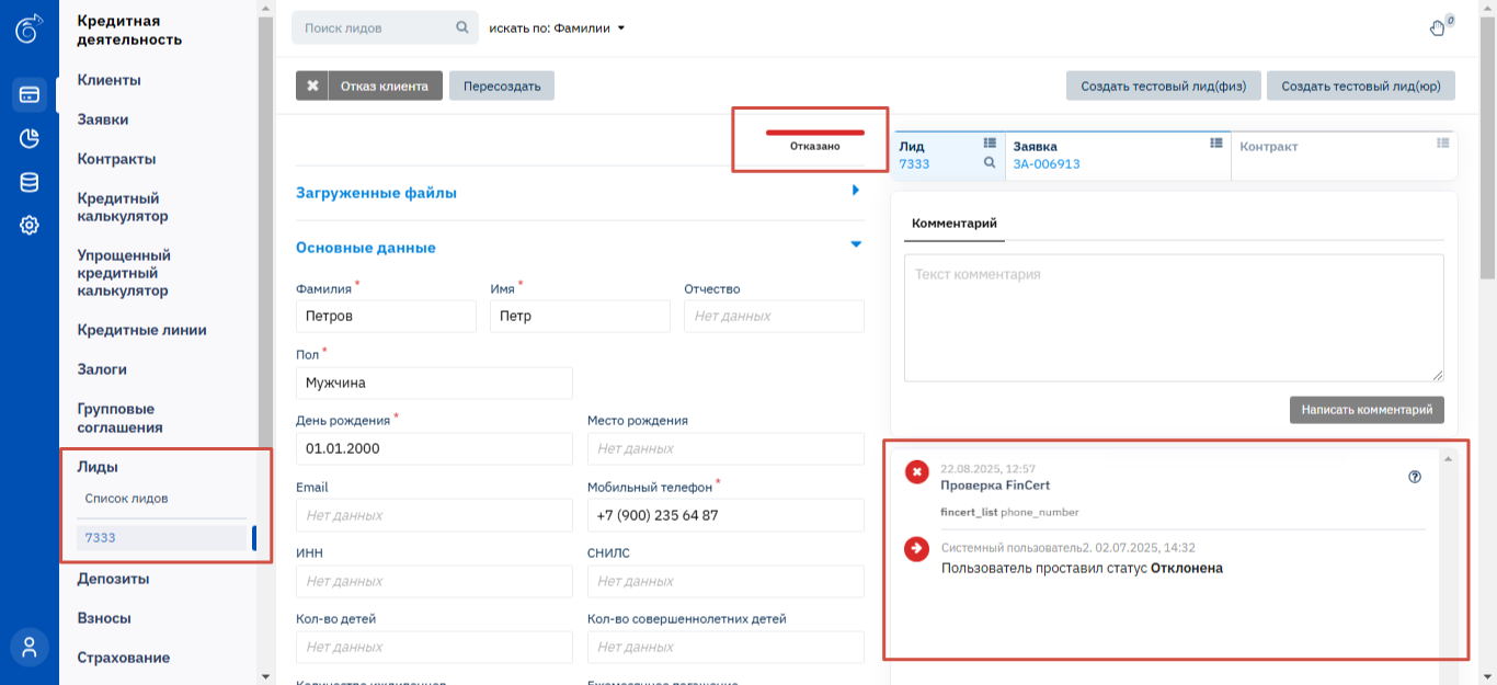 Если перейти в карточку лида, то также будет отображаться информация о результате проверки по данным ФинЦЕРТ. В случае, если найдено совпадение и шаг проверки был блокирующим, статус лида будет отмечен как «Отказано».